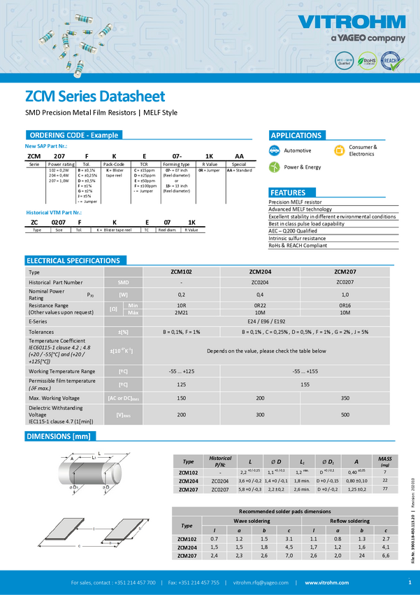 VitrOhm ZCM207FKE07-4K7AA ZCM207FKE07-4K7AA Rezystor precyzyjny 4.7 kΩ SMD 0207 1 W 1 % 1 szt.