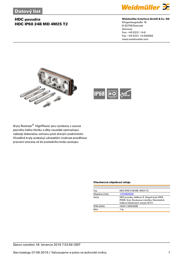 Weidmüller HDC IP68 24B MD 4M25 T2 1220860000 obudowa HDC, Wielkość konstrukcyjna: 8, Stopień ochrony: IP 68, wieko, Zam
