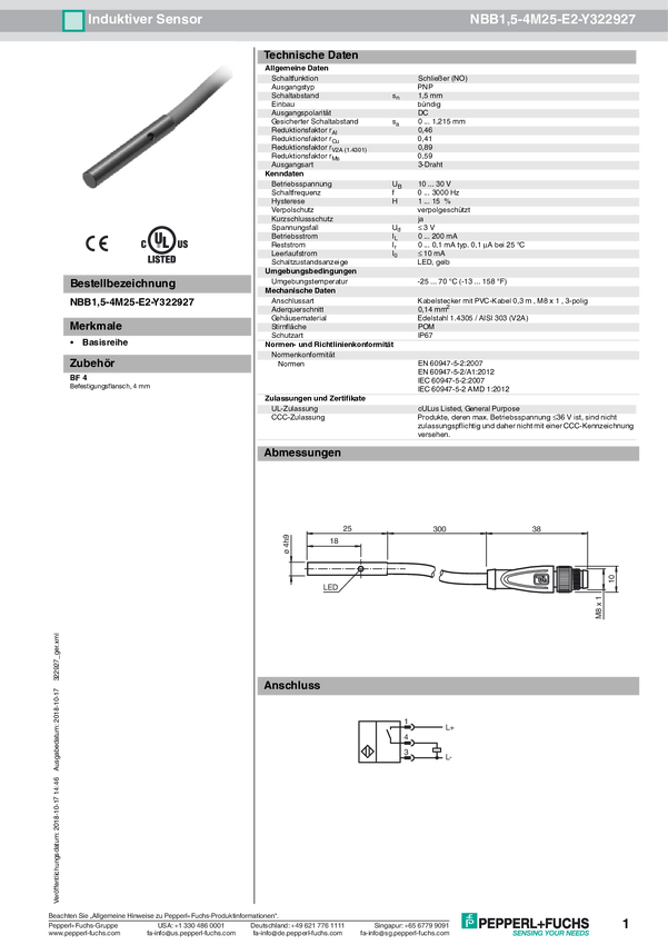 Pepperl+Fuchs Czujnik indukcyjny podtynkowy PNP NBB1,5-4M25-E2-Y322927