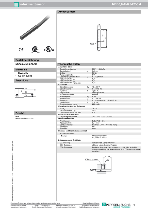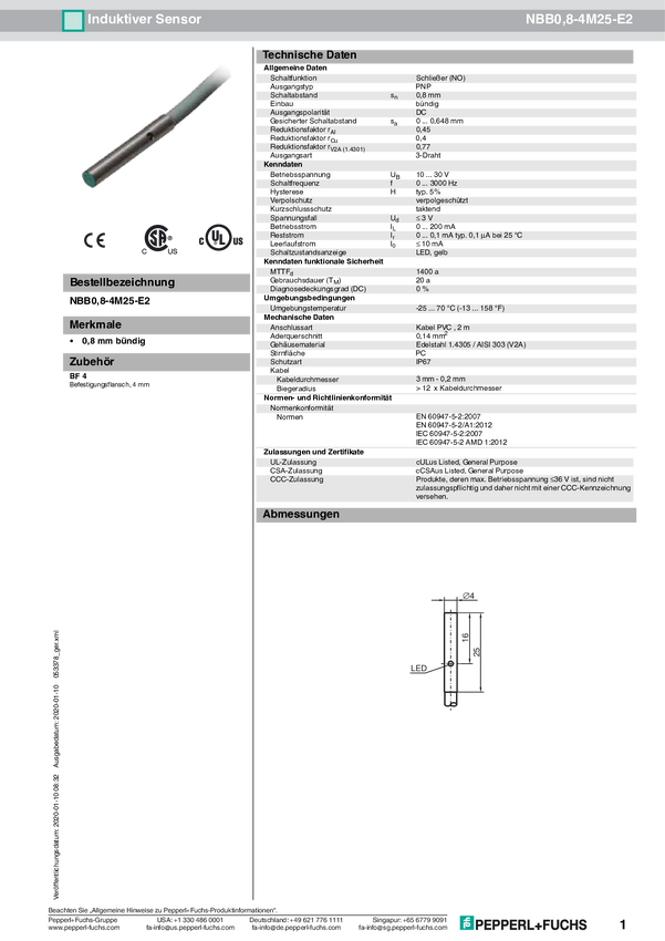 Pepperl+Fuchs Czujnik indukcyjny podtynkowy PNP NBB0,8-4M25-E2