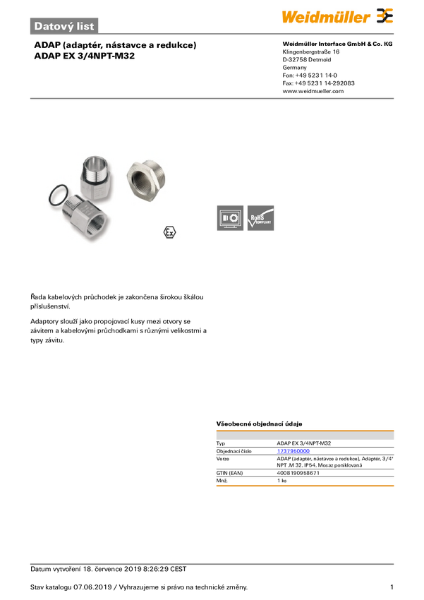 Weidmüller 1737950000 ADAP EX 3/4NPT-M32 Adapter dławnicy kablowej 3" M32 mosiądz mosiądz 1 szt.