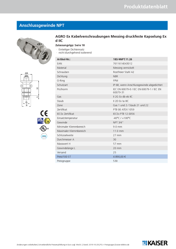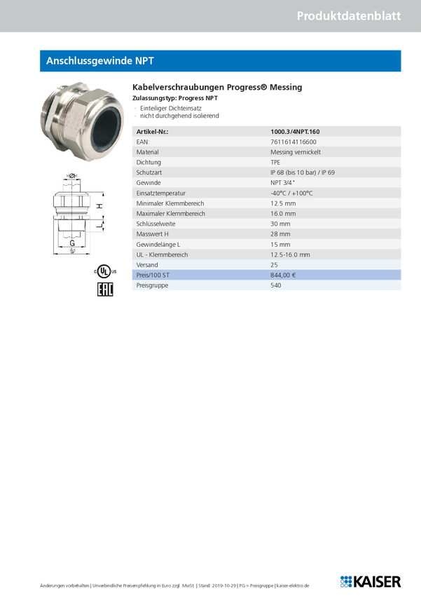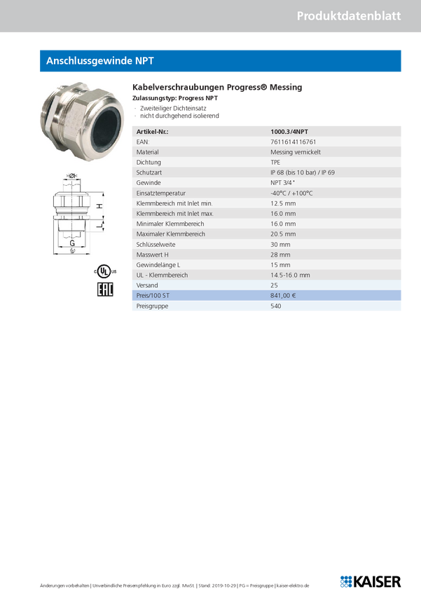 Kaiser Elektro 1000.3/4NPT Dławnica kablowa Kaiser, od 12.50 mm, do 20.50 mm, 3/4", 1 szt.