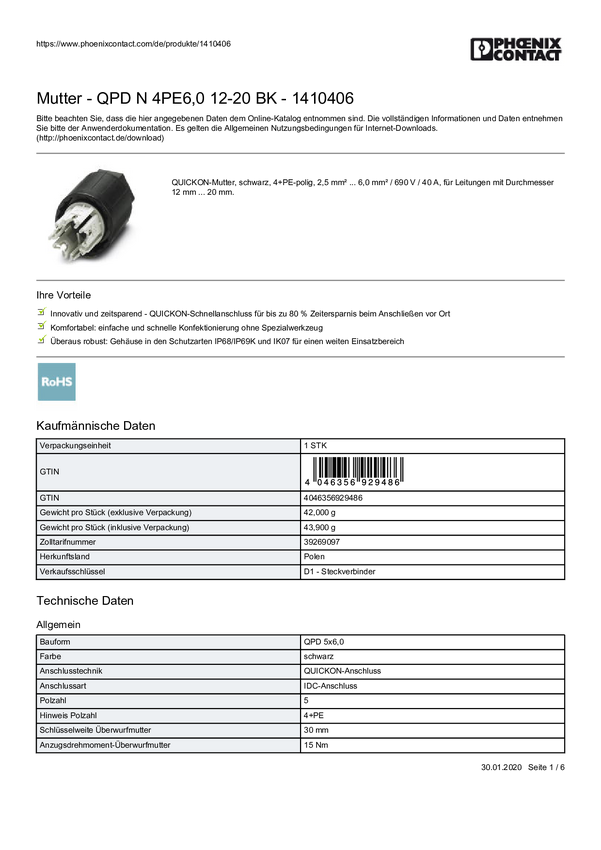 Phoenix Contact 1410406 Nakrętka QPD N 4PE6,0 12-20 BK, 1 szt.