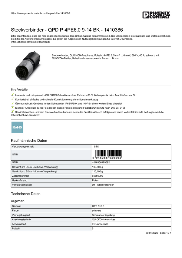 Phoenix Contact 1410386 Złącze męskie QPD P 4PE6,0 9-14 BK, 1 szt.