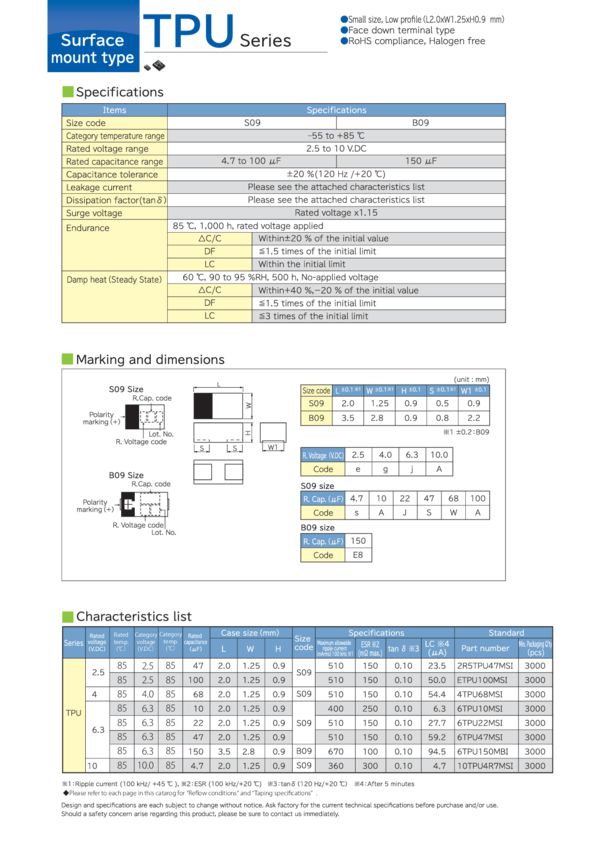 Cap Tant Solid 10uF 6.3V S09 CASE 20% (2 X 1.25 X 0.9mm) SMD 2012,S09 0.25 Ohm 85°C Embossed T/R