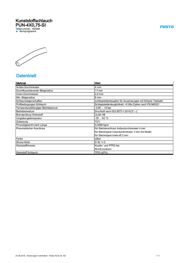 Wąż do sprężonego powietrza FESTO PUN-4X0,75-SI 152584 10 bar 50 m