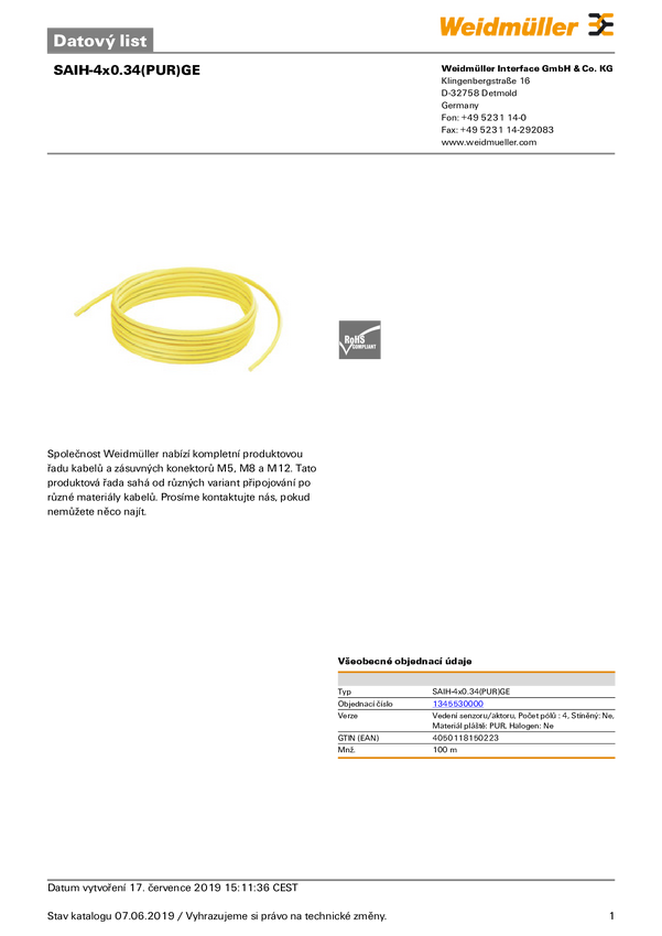 Weidmüller 1345530000 Złącze konfekcjonowane czujnika/aktuatora SAIH-4x0.34(PUR)GE, piny: 4, 100 m