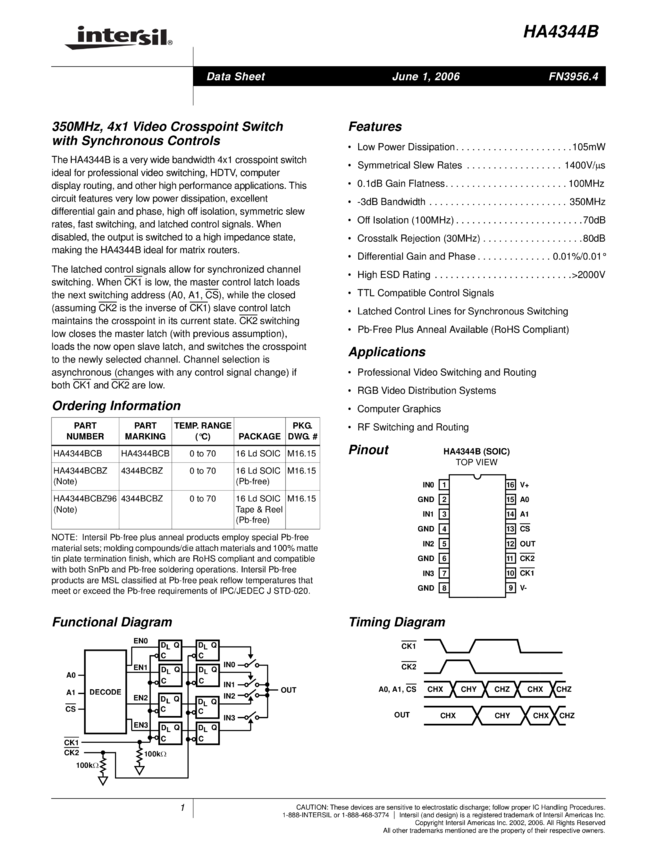 350MHz, 4x1 Video Crosspoint Switch with Synchronous Controls