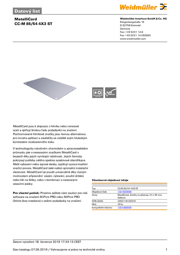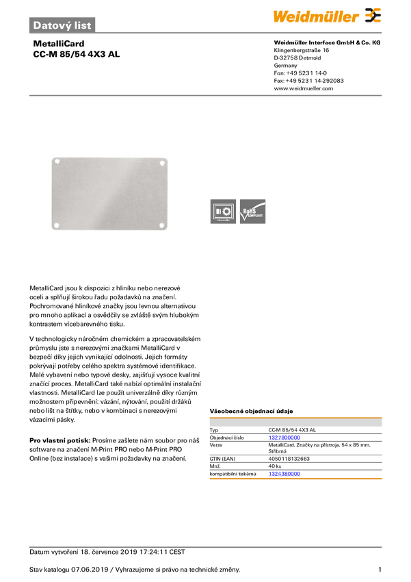 Weidmüller 1327800000 CC-M 85/54 4X3 AL Tabliczka znamionowa Sposób montażu: śruba, nit Pole powierzchni etykietowania: