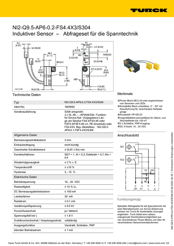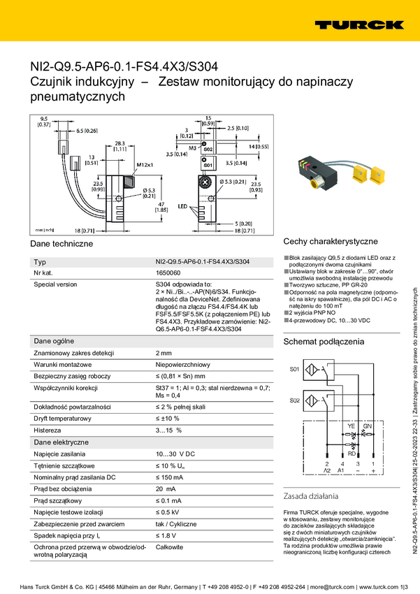 Turck Czujnik indukcyjny nie podtynkowy PNP, Zamykający NI2-Q9,5-AP6-0,15-FS4.4X3/ S304