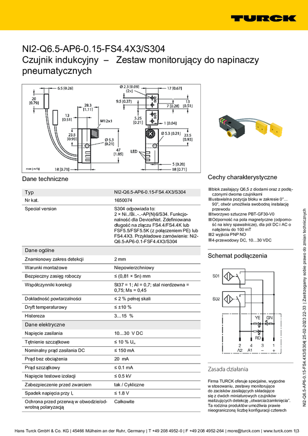 Turck Czujnik indukcyjny nie podtynkowy PNP, Zamykający NI2-Q6,5-AP6-0,2-FS4.4X3/S304