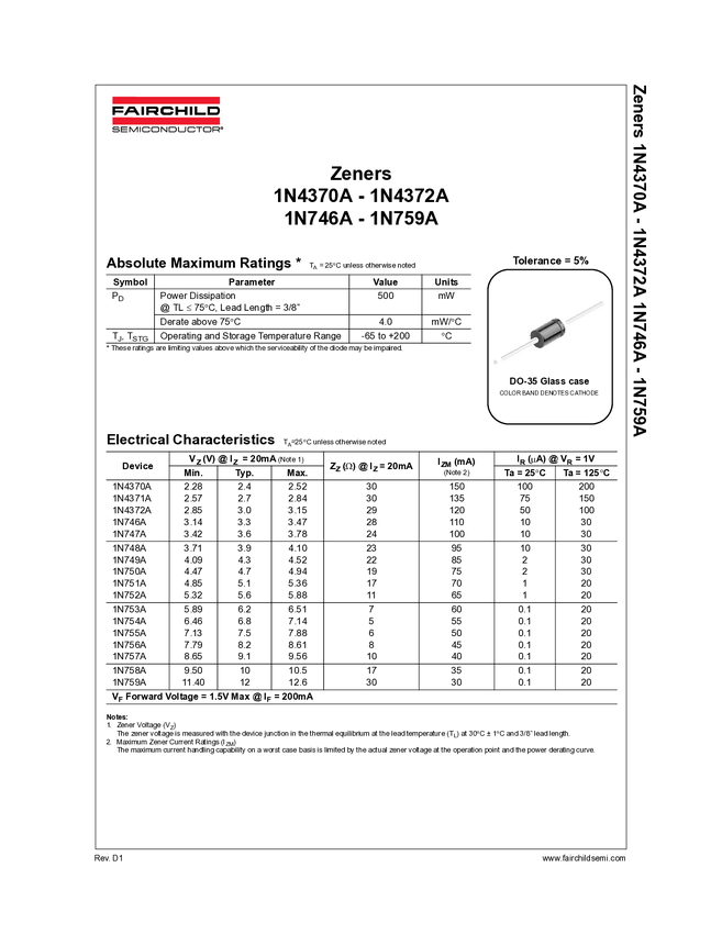 Fairchild / motorola Dioda Zenara 5,6V 0,4W 1N752A podobna do BZX83V005,6