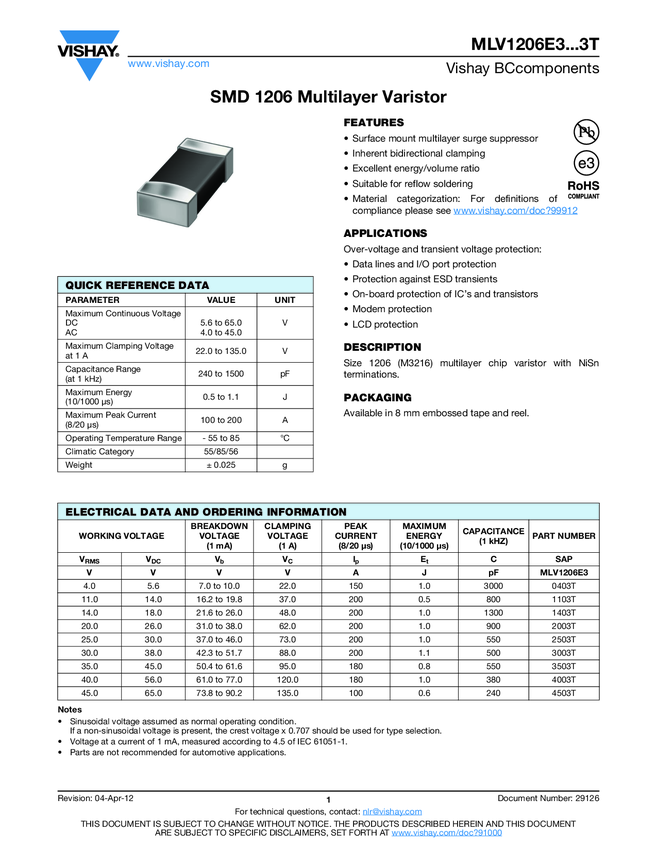 Var 4V 5.6V 7 to 10V 1206 SMD Embossed T/R