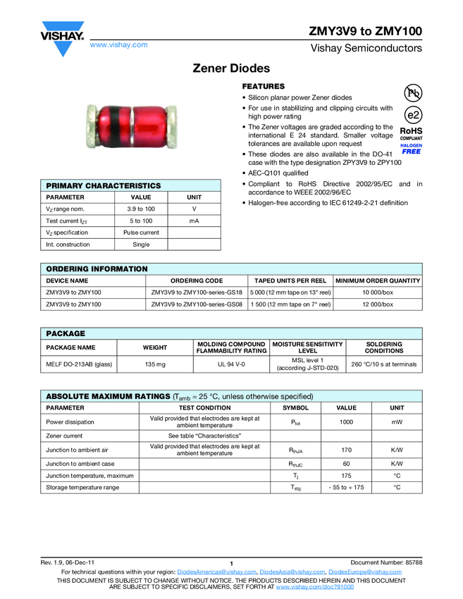 Diode Zener Single 5.6V 7% 1W 2-Pin MELF Glass T/R