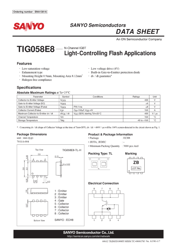 IGBT 400V 150A VCE(sat);5.6V max. N-Channel Single ECH8