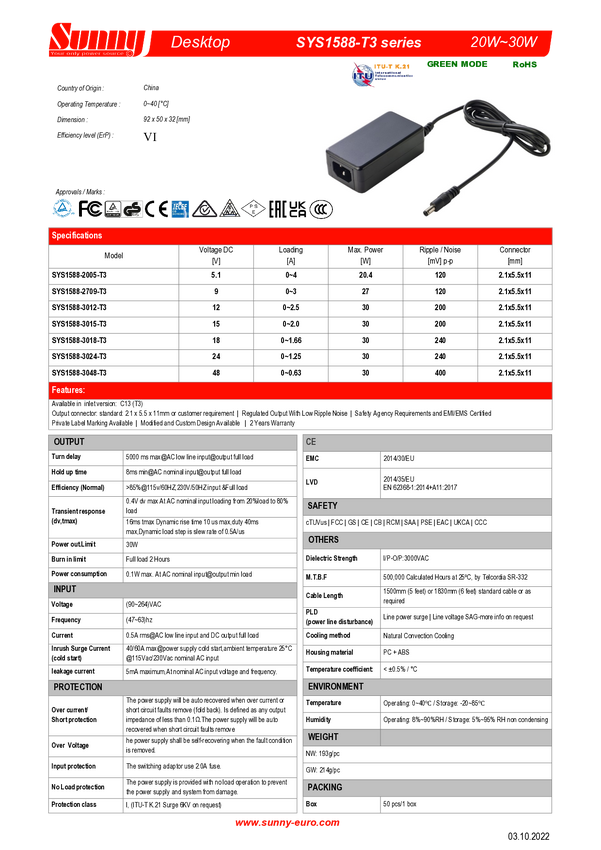 Zasilacz desktop SUNNY 5,1V 4A 20,4W | SYS1588-2005-T3