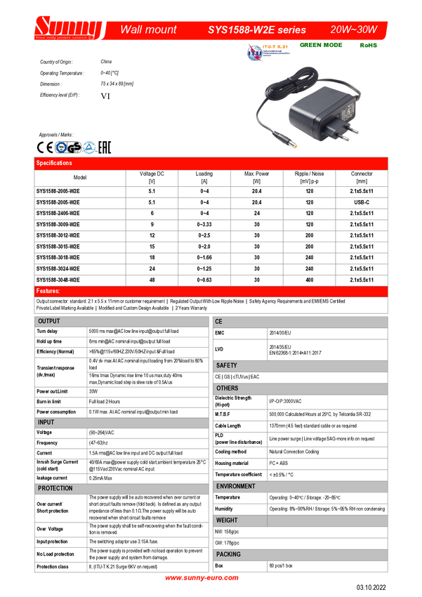 Zasilacz wtyczkowy SUNNY 5,1V 4A 20,4W | SYS1588-2005-W2E