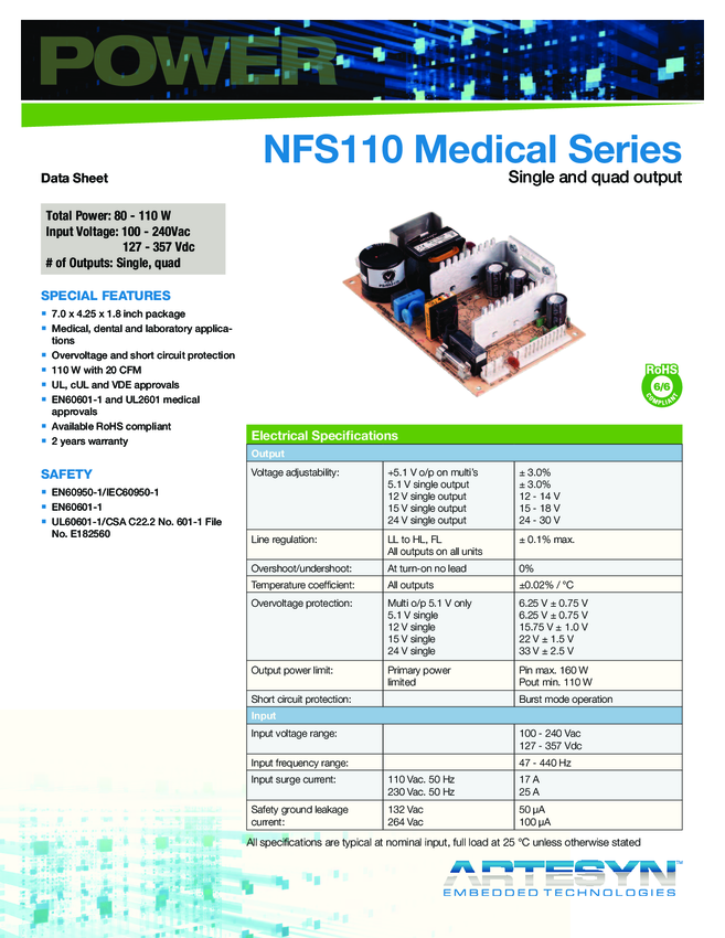 AC/DC Power Supply Quad-OUT 5.1V/12V/-12V/-5V 8A/4.5A/0.5A 110W 16-Pin