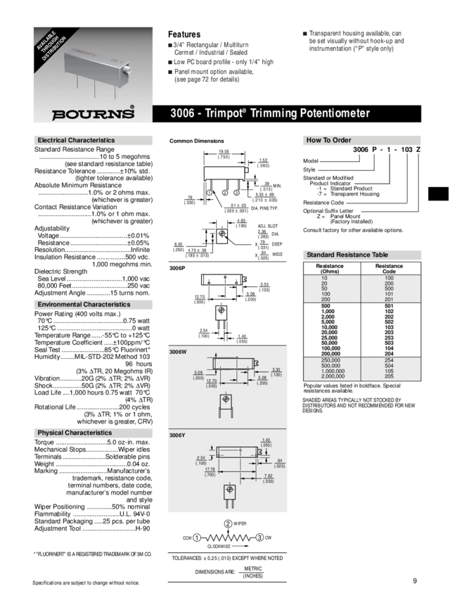 Res Cermet Trimmer 200 Ohm 10% 1/2W 1(Elec)/1(Mech)Turn 3.05mm (9.53 X 9.53 X 4.83mm) Pin Thru-Hole Tube