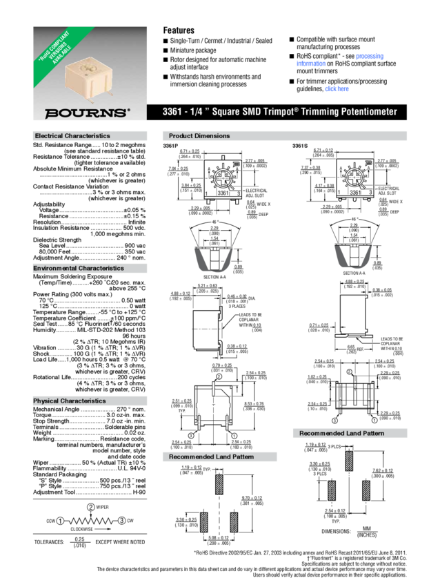 Res Cermet Trimmer 10K Ohm 10% 1/2W 1(Elec)/1(Mech)Turn 2.77mm (6.71 X 6.65 X 7.37mm) Gull Wing SMD Embossed T/R