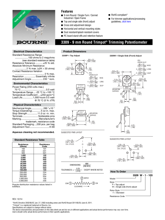 Res Cermet Trimmer 50K Ohm 10% 1/4W 12(Elec)Turn 1.78mm (6.35 X 6.36 X 8.46mm) Gull Wing SMD Embossed T/R