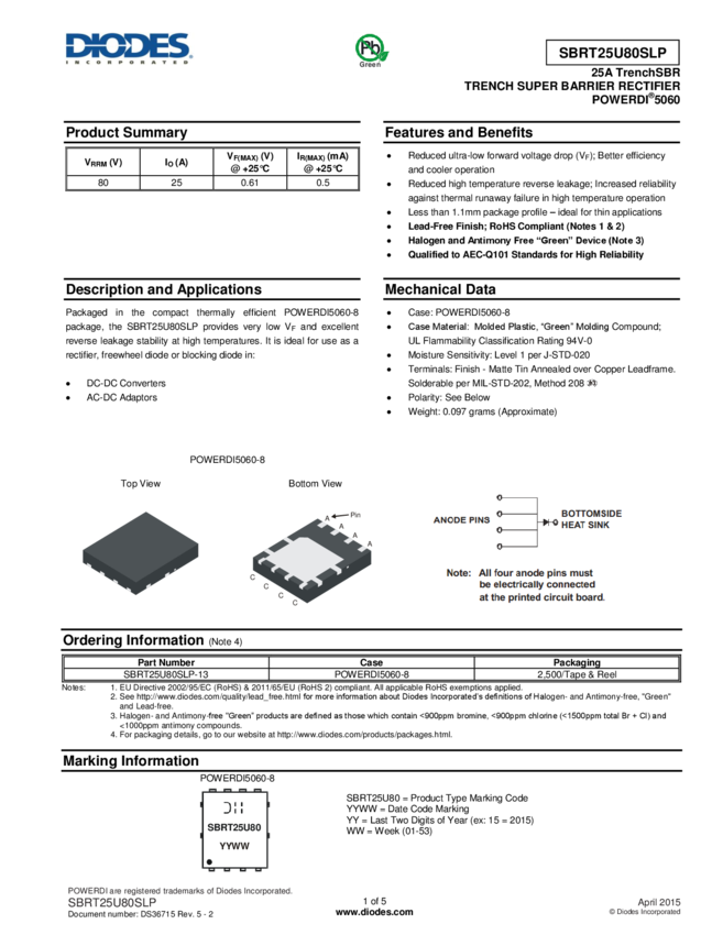Diode Super Barrier Rectifier 80V 25A 8-Pin PowerDI 5060 T/R