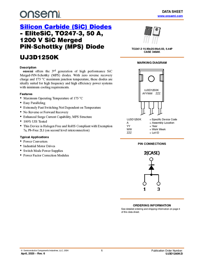 Silicon Carbide (SiC) Diode - EliteSiC, TO-247-2L, 50A, 1200V SiC Merged PiN-Schottky (MPS) Diode
