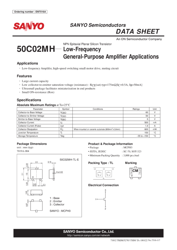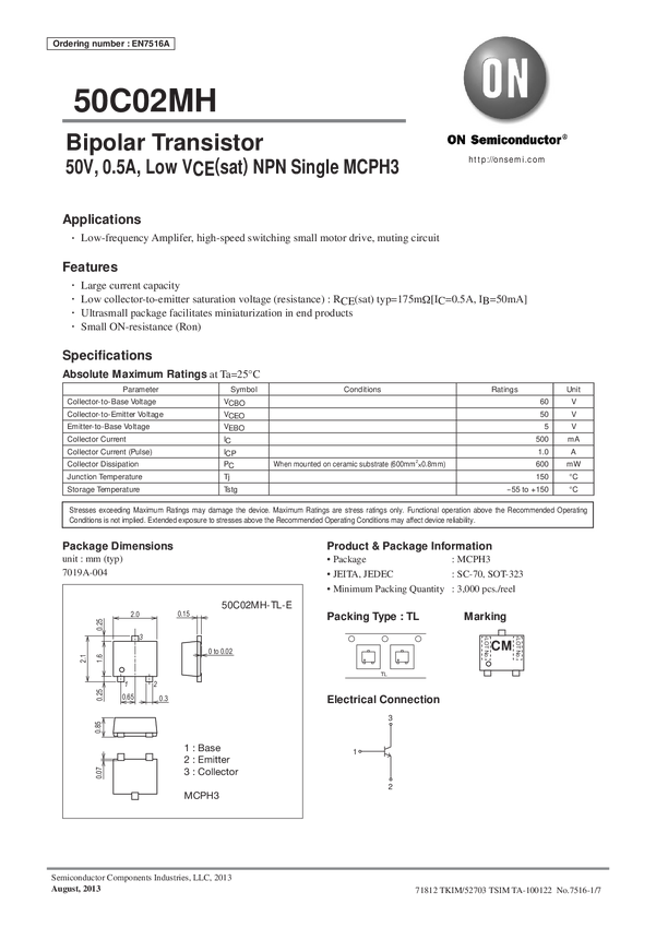 Bipolar Transistor, 50V, 0.5A, Low VCE(sat), NPN Single MCPH3