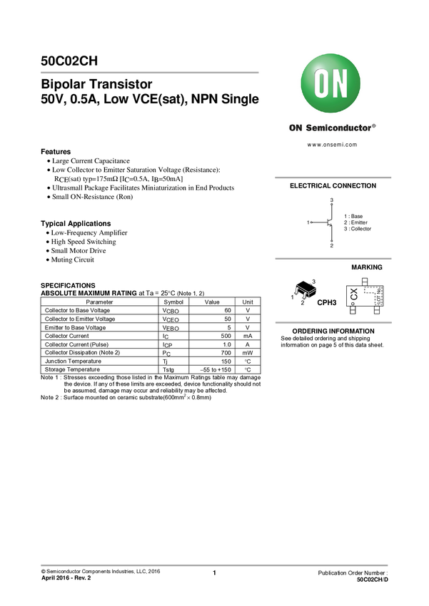 Bipolar Transistor, 50V, 0.5A, Low VCE(sat), NPN Single