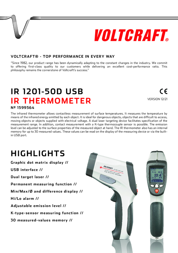 VOLTCRAFT IR 1201-50D USB Pirometr Kalibracja (ISO) Optyka 50:1 -50 - 1200 °C Termometr bezdotykowy