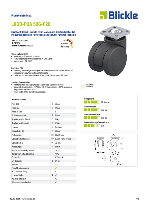 Blickle 845577 LKDB-PUA 50G-ES Podwójna rolka skrętna z tworzywa sztucznego Średnica koła: 50 mm Maksymalne obciążenie: