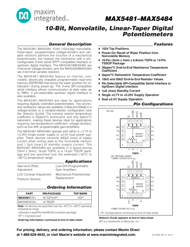 MAX5484 1024-Tap 50k Nonvolatile Linear-Taper Digital Potentiometer (Variable Resistor)