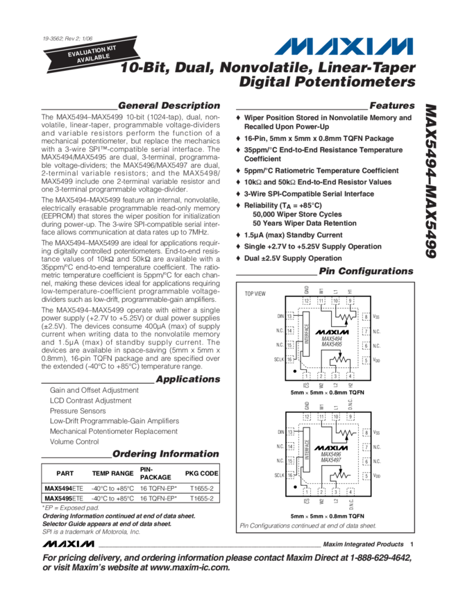 MAX5499 1024-Tap Dual 50k Nonvolatile Linear-Taper Digital Potentiometer (Voltage Divider/Variable Resistor)