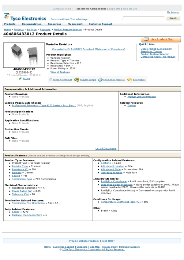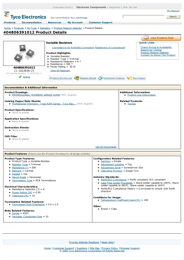 Res Cermet Trimmer 50K Ohm 10% 1/4W 12(Elec)Turn 1.78mm (6.71 X 7.5 X 4.42mm) Pin Thru-Hole Tube