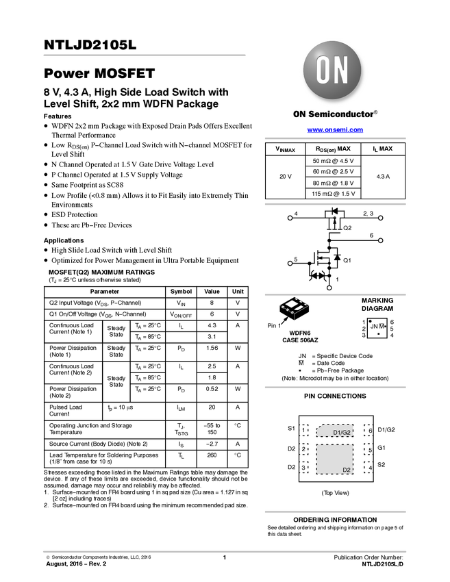 Power MOSFET 8V 4.3 A 50mOhm N-Channel WDFN Load Switch with Level Shift