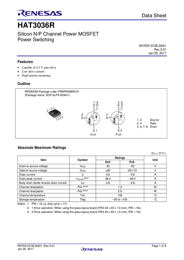 Nch/Pch Dual Power Mosfet 30V -4.8A 50Mohm Sop8