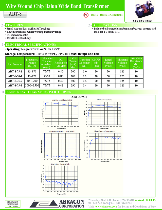 RF BALUN, 45-870MHZ, 50/50OHM, 1.2DB MAX, 0805, 2X1.2X1.2MM,