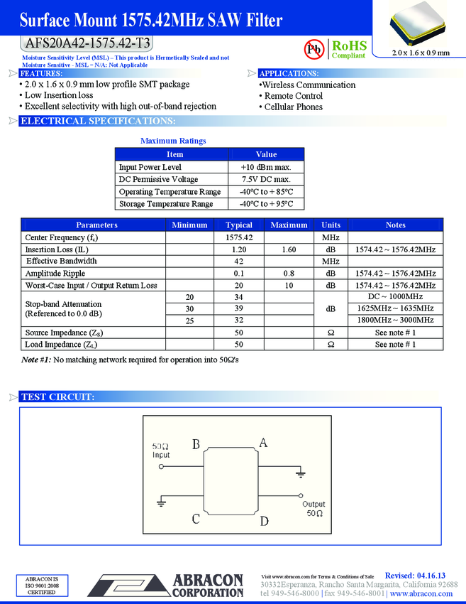 SAW Filter 1575.42MHz 42MHz 50Ohm SMD 4-Pin SMD T/R