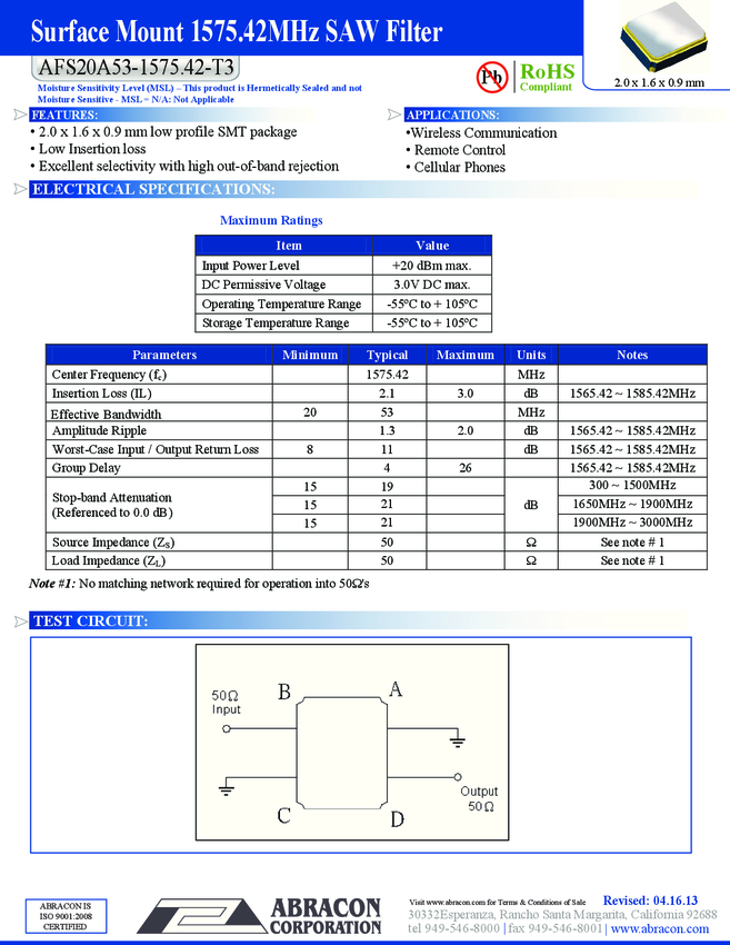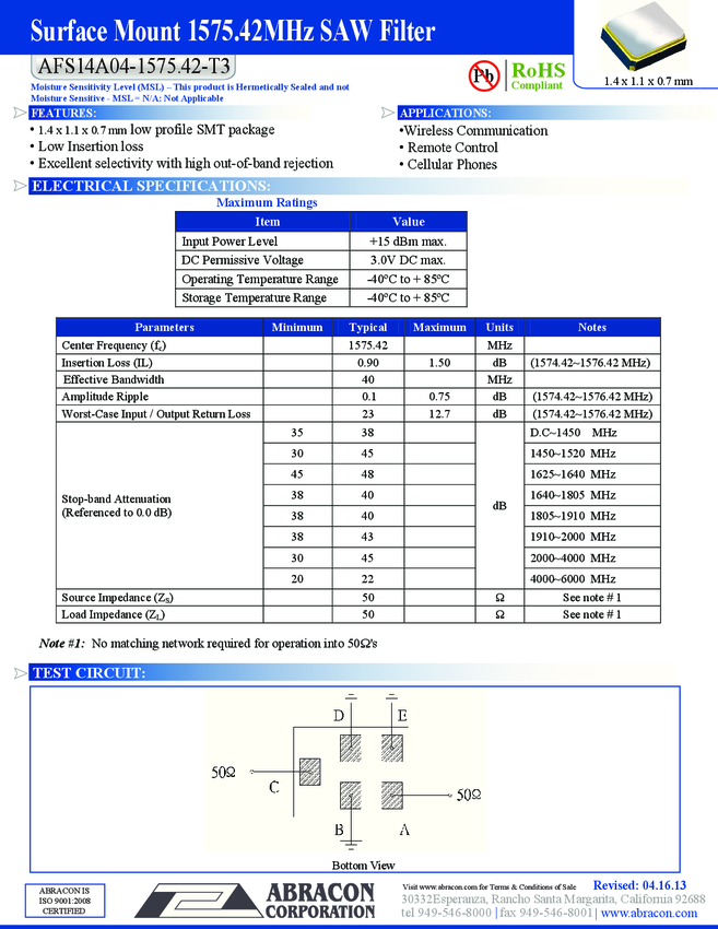 SAW Filter 1575.42MHz 53MHz 50Ohm SMD 4-Pin SMD T/R