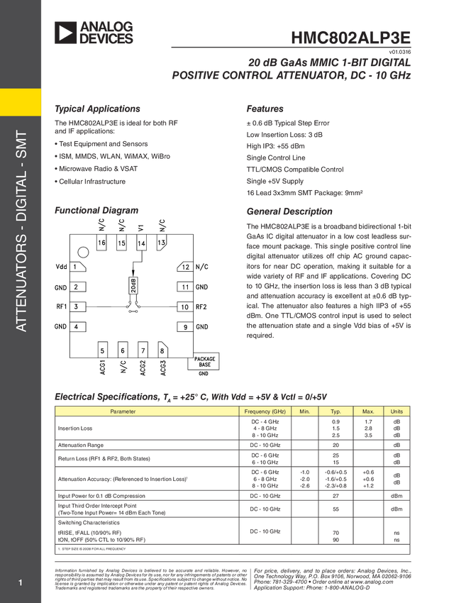 Układ scalony; tłumik; HMC472ALP4E; 50Ohm; 31,5dB; 3,8GHz; 6 bit; 1 kanał; 5V; QFN16; SMD; ANALOG DEVICES; RoHS