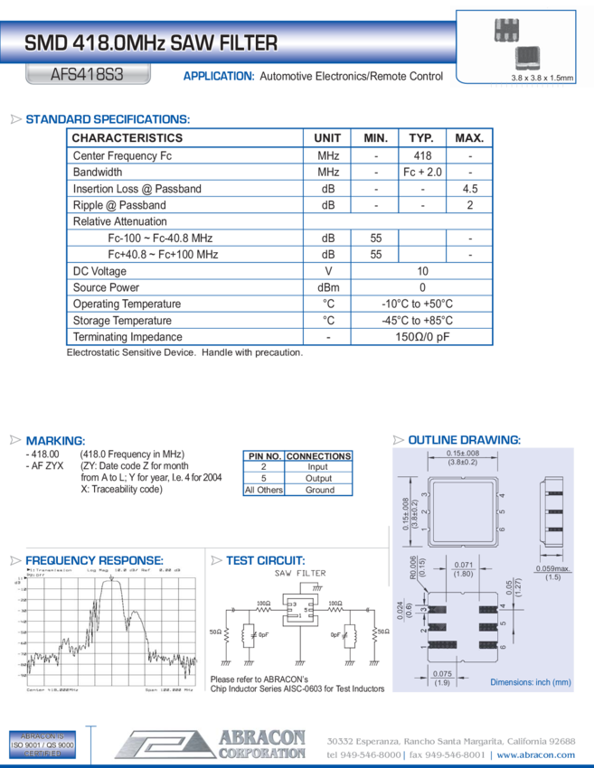 SAW Filter 418MHzFrequency 50Ohm//0pF SMD 6Pin SMD