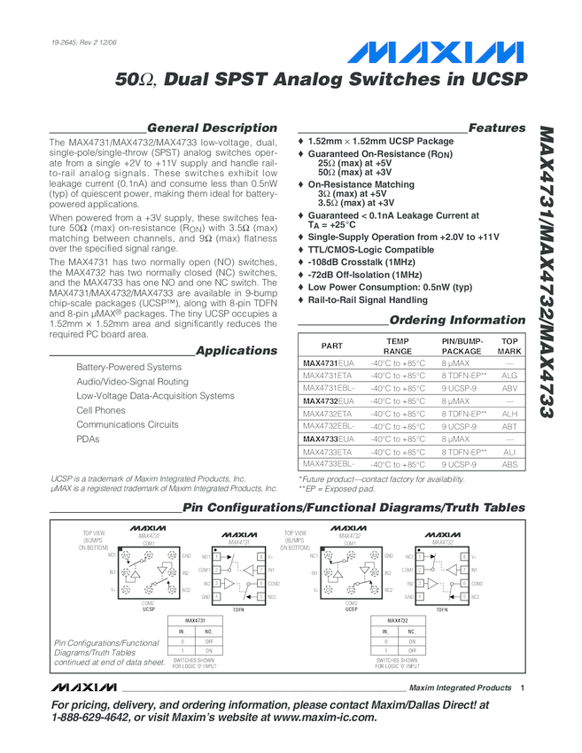 MAX4733 50ohm, Dual SPST Analog Switch in UCSP