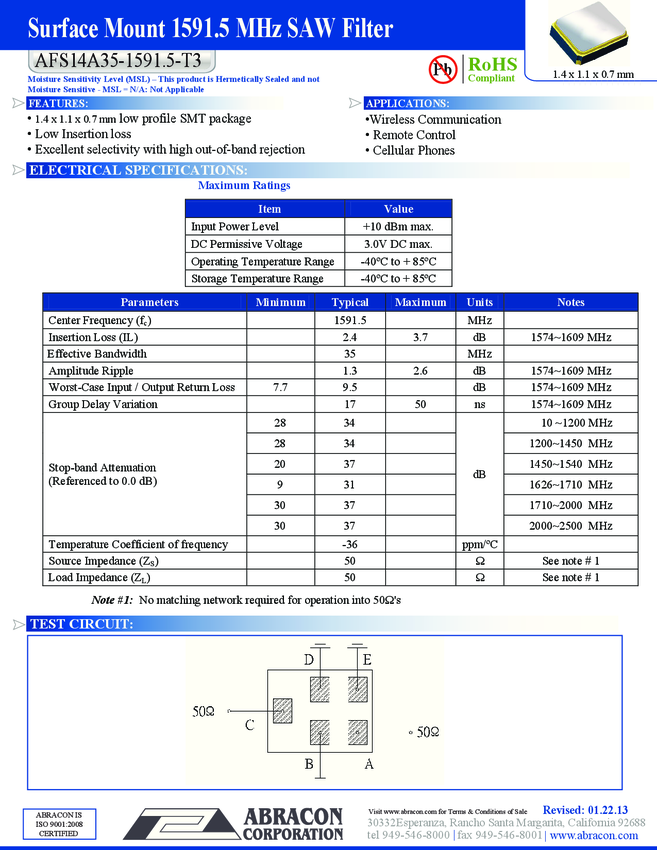SAW Filter 1591.5MHz 35MHz 50Ohm SMD 5-Pin SMD T/R