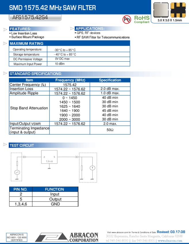 SAW Filter 1575.42MHz 50Ohm SMD 6-Pin T/R