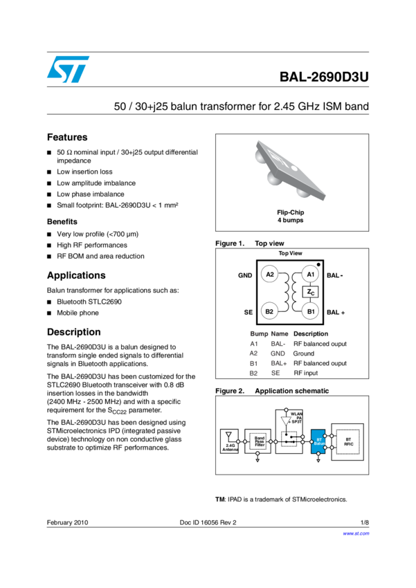 RF Transformer 50Ohm 2402MHz to 2480MHz SMD