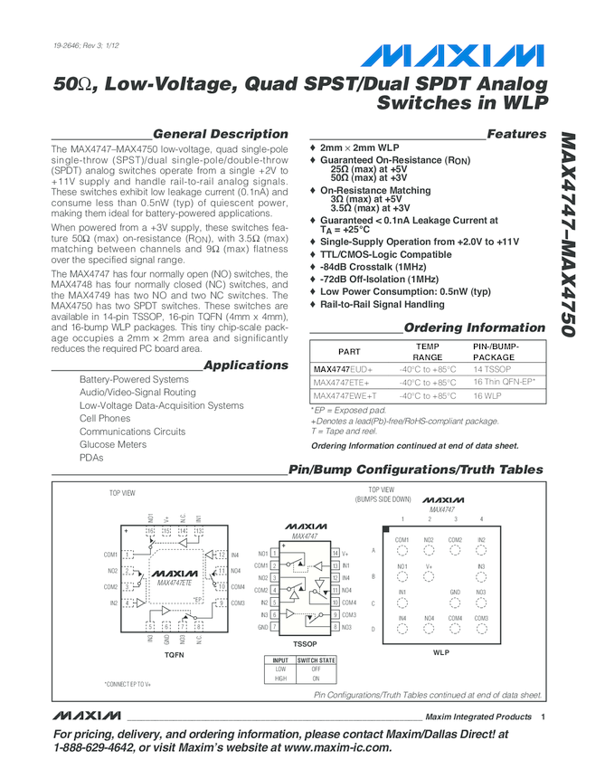 MAX4750 50ohm, Dual SPDT Switches in UCSP
