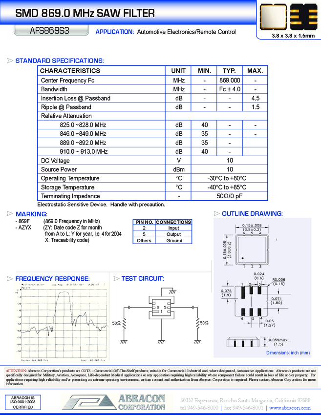 SAW Filter 869MHz 50Ohm SMD 6-Pin SMD T/R