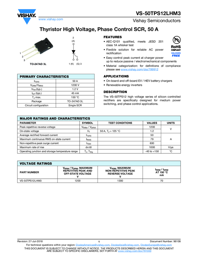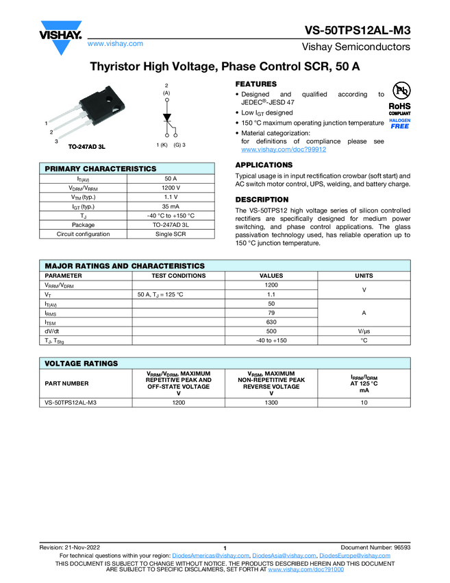 Thyristor High Voltage, Phase Control SCR, 50 A