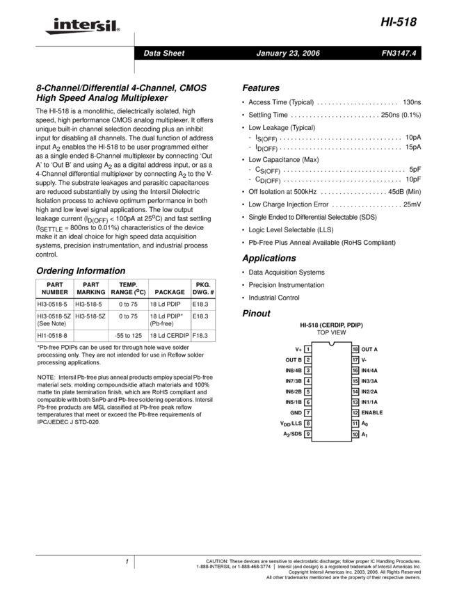 8-Channel/Differential 4-Channel, CMOS High Speed Analog Multiplexer