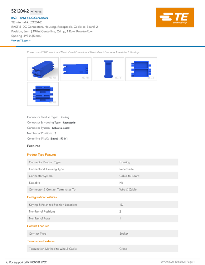TE Connectivity 521205-1 TE AMP RAST 5 Connectors, 1 szt.